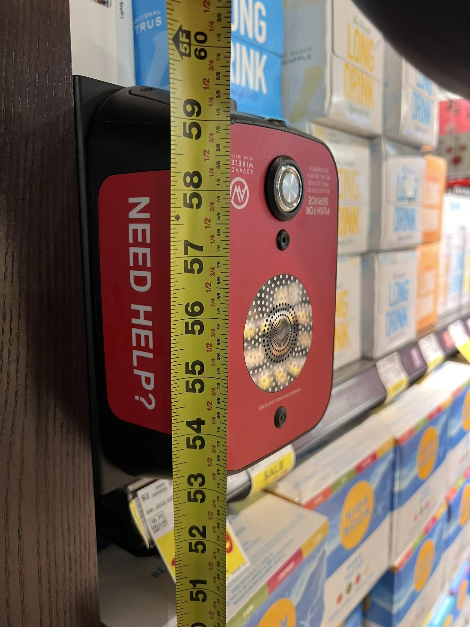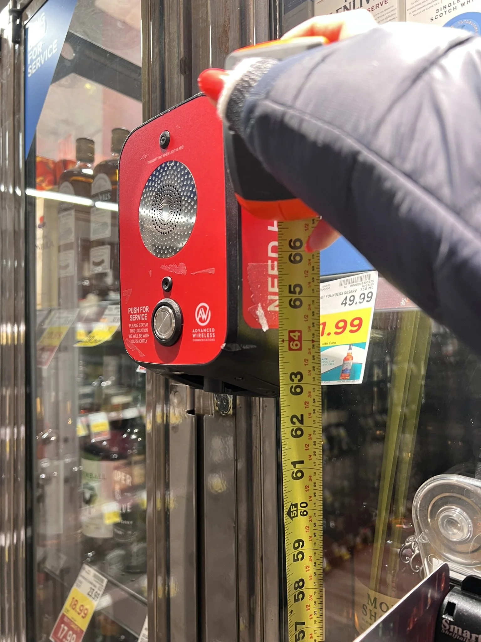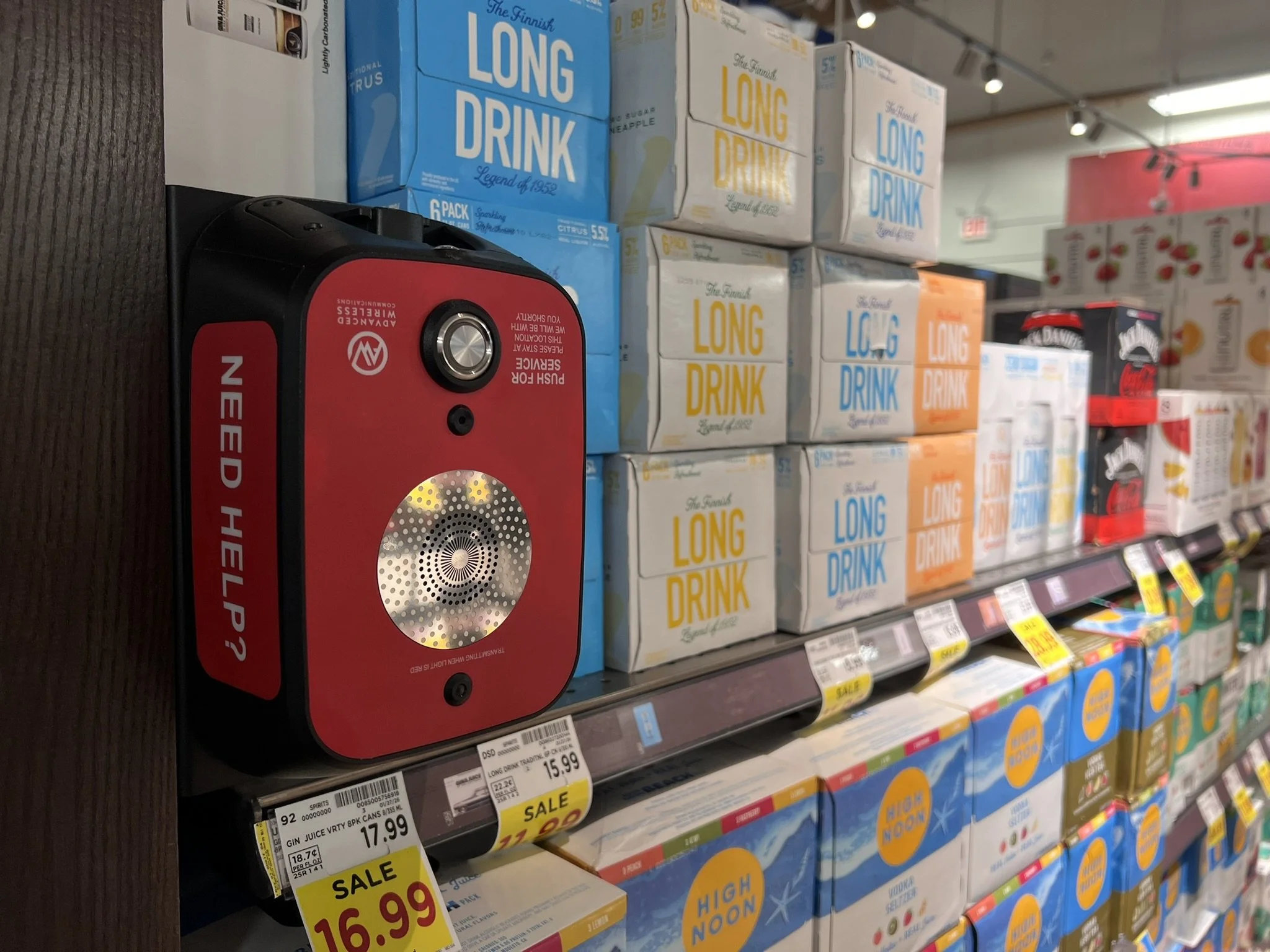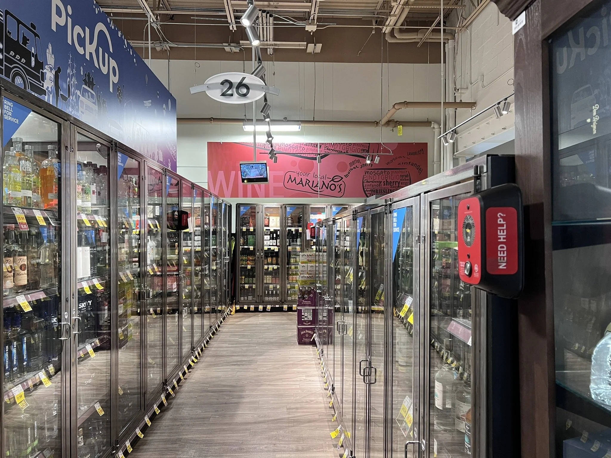 ID: A grocery aisle with steel and glass doors inclosing the liquor selection. Bright red “Need Help"?” button boxes are mounted high off the ground.